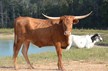 Beautiful brindle cow, Susie Q, has great conformation and nice lateral-growing horns that are starting to tip up.